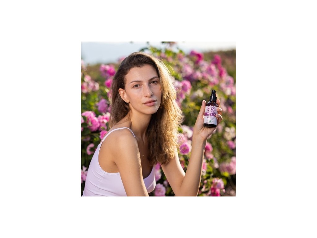 Ružová voda je známa svojimi schopnostiam osviežiť pokožku a udržať jej optimálnu rovnováhu vlhkosti. Svojím účinkom vyhladzuje jemné línie a vrásky, poskytujúc pleti jasnejší a žiarivejší vzhľad. Táto voda nie je len pre pleť, ale môže slúžiť ako tajná zbraň pre vaše vlasy. Môžete ju použiť na výživu a hydratáciu vlasov a dokáže predchádzať nežiaducemu krepateniu. Ružová voda Alteya Organics pochádza z 100% organicky vypestovaných a eticky zozbieraných kvetov ruží, ktoré sa pestujú na rodinnej ružovej farme v srdci bulharského ružového údolia.