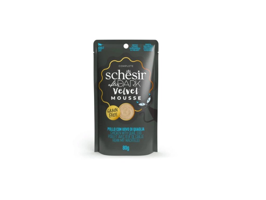 Schesir Cat After Dark Velvet kapsička - kuracie a prepeličie vajce sú na jemno vyšlahané tie najlepšie časti mäsa do dokonalej peny, ktorá chutí všetkým mačkam. Kompletné krmivo určené pre dospelé mačky.Dodatočné parametre