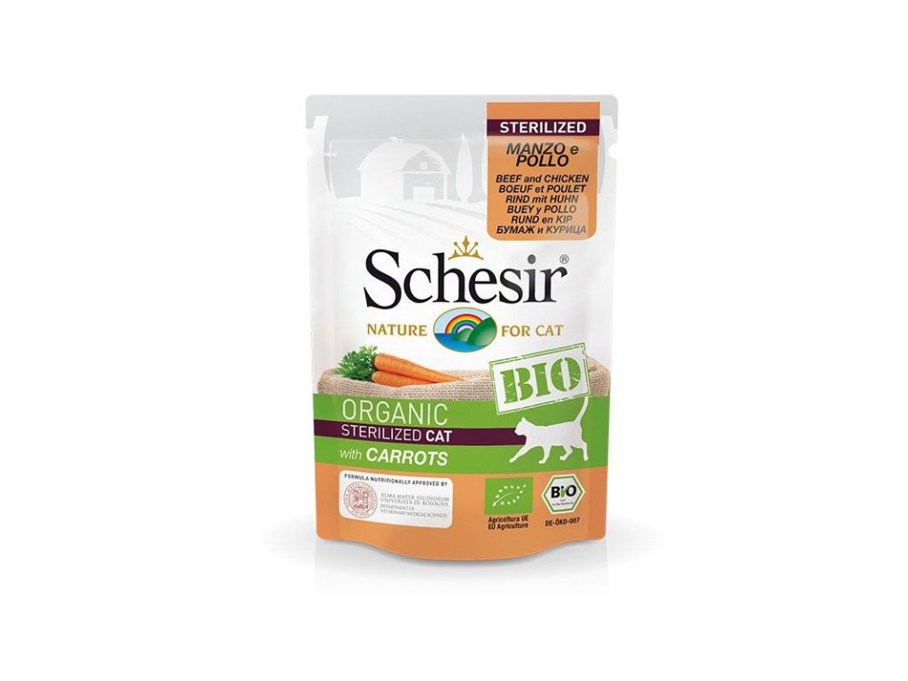 Schesir BIO Sterilized - hovädzie a kuracie s mrkvou predstavuje lahodnú a vyváženú stravu pre sterilizované mačky.Dodatočné parametre