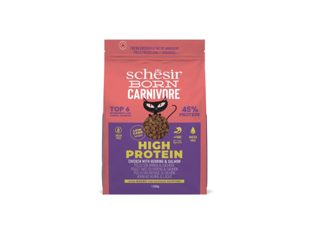 Schesir Cat Born Carnivore Adult - Čerstvé kuracie so sleďom a lososom je kompletné krmivo vo forme pomaly pečených granúl pre dospelé mačky s vysokým obsahom bielkovín. Receptúra Born Carnivore bola vyvinutá pre skutočných mačacích mäsožravcov s fyziologickou potrebou prijímať čerstvé mäso a ryby. Receptúra inšpirovaná prirodzenou potravou mačiek vo voľnej prírode s vysokým obsahom bielkovín (45%) pri nízkom obsahu sacharidov (11,3%).Dodatočné parametre