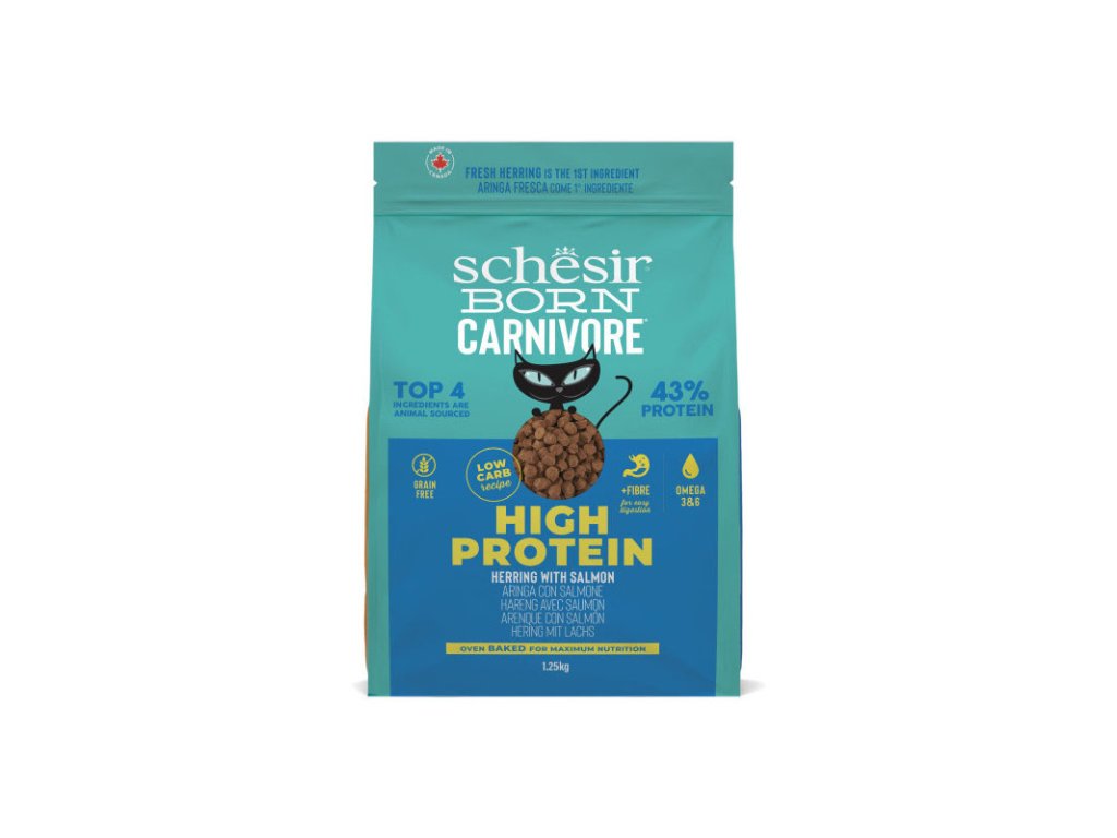 Schesir Cat Born Carnivore Adult - Čerstvý sleď a losos je kompletné krmivo vo forme pomaly pečených granúl pre dospelé mačky s vysokým obsahom bielkovín. Receptúra Born Carnivore bola vyvinutá pre skutočných mačacích mäsožravcov s fyziologickou potrebou prijímať čerstvé ryby. Receptúra inšpirovaná prirodzenou potravou mačiek vo voľnej prírode s vysokým obsahom bielkovín (43%) pri nízkom obsahu sacharidov (12%).Dodatočné parametre