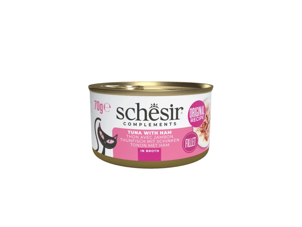 Schesir Cat - Tuniak so šunkou vo vývare je doplnkové krmivo pre dospelé mačky.Dodatočné parametre