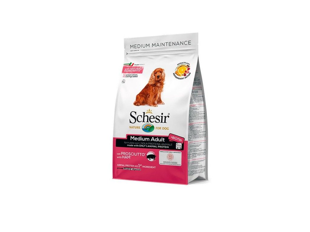 Schesir Dog Medium Adult - bravčová šunka s ryžou je kompletné krmivo pre psov stredných plemien.Dodatočné parametre