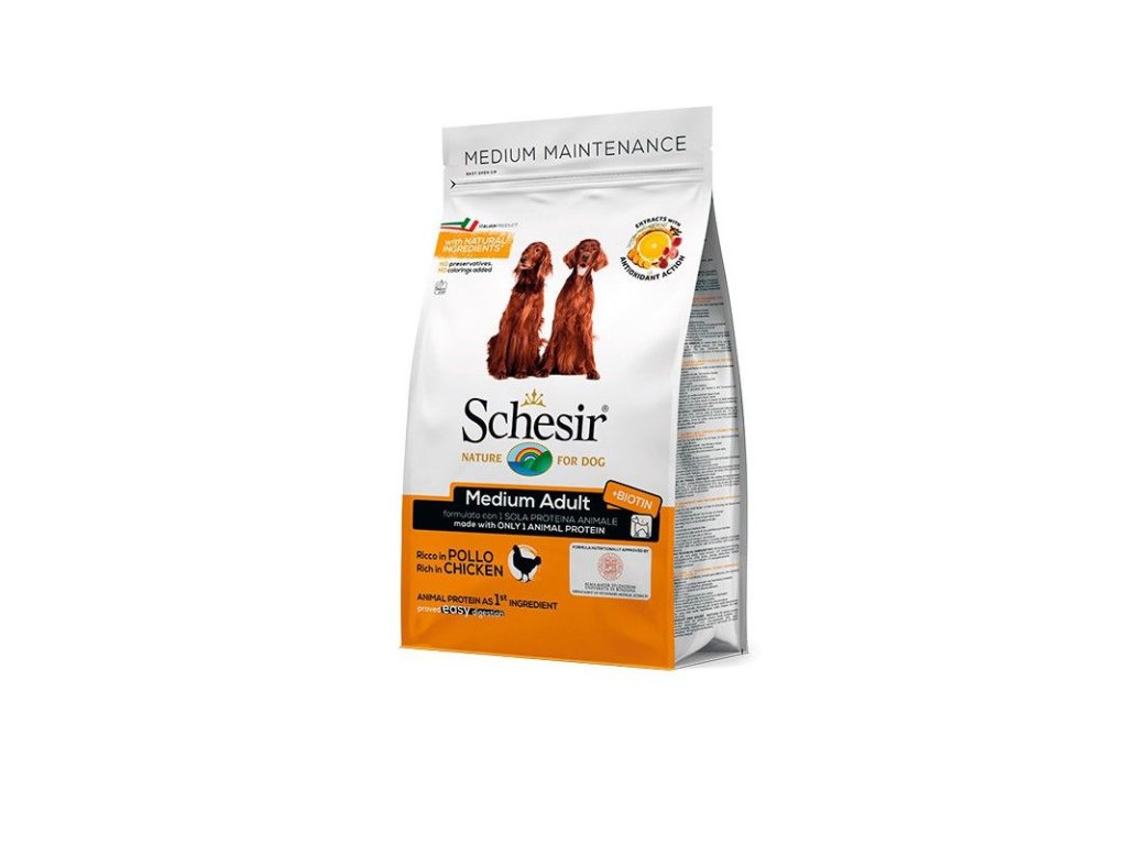 Schesir Dog Medium Adult - kuracie s ryžou je kompletné krmivo pre psov stredných plemien.Dodatočné parametre