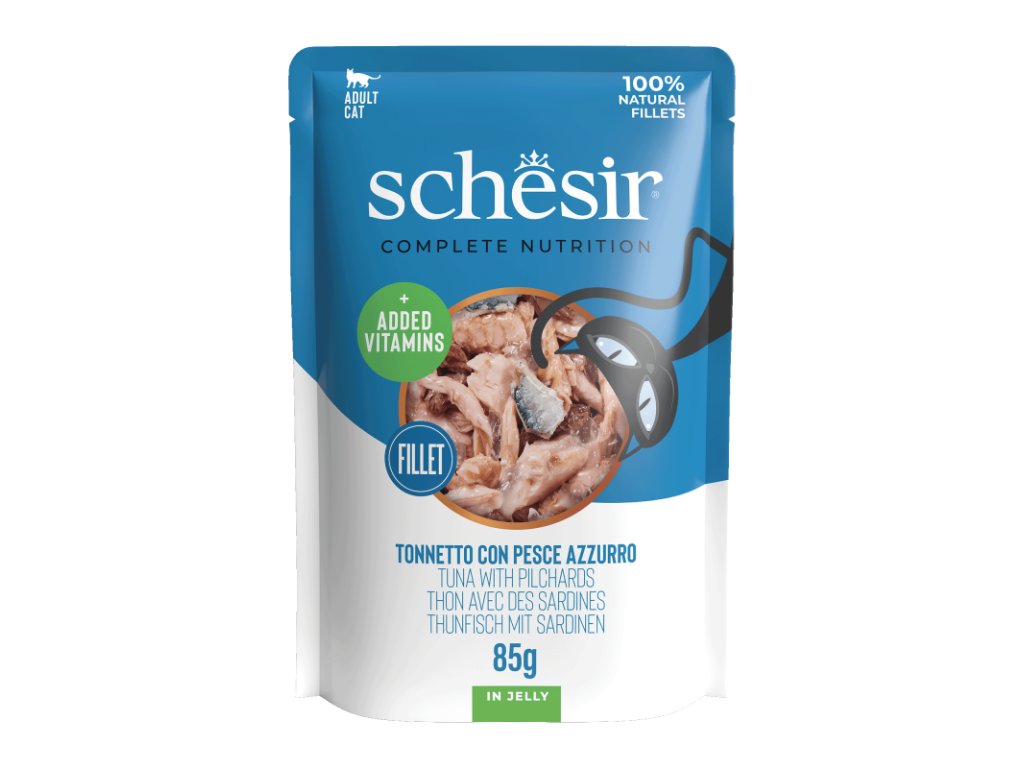 Schesir Jelly Cat - Tuniak so sardinkami v želé je kompletné krmivo pre dospelé mačky.Dodatočné parametre