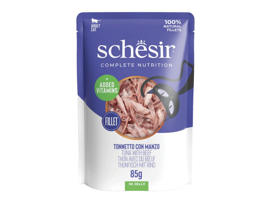 Schesir Jelly Cat - Tuniak s hovädzím a ryžou v slečnicovom oleji je kompletná strava z celých filiet tuniaka uvareného vo vlastnom vývare s ryžou.Dodatočné parametre