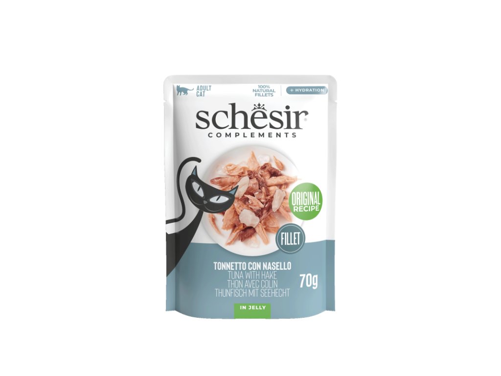 Schesir Jelly Cat - Tuniak s morskou šťukou a ryžou je kompletná strava z celých filiet tuniaka a morskej štuky vo vlastnom vývare s ryžou.Dodatočné parametre