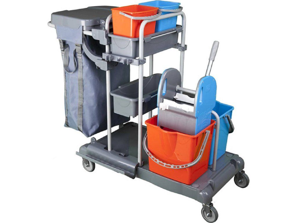 Servisný upratovací vozík 2x6L a 2x25L vedrá, 2 vaničky,chrómová konštrukcia, žmýkací lis, 120L PVC nádoba Tento servisný upratovací vozík v profesionálnej kvalite, pozostáva z pevnej pochrómovanej kovovej konštrukcie a je navrhnutý pre komplexné upratovanie väčších priestorov. Vozík má stabilné otočné kolieska. Veko na odpad alebo bielizeň je vyrobené z pevného PVC materiálu. Servisný vozík je vybavený dvoma malými vedrami a dvoma vaničkami, ktoré je možné využiť na rôzne saponáty, čistú vodu, upratovacie pomôcky, skladovanie čistých vecí a iné.. Ďalšie 2 vedrá s 25 litrovým objemom a lisom(žmýkačom) slúži pre žmýkanie mopov a umývacie prostriedky na podlahu. Tento vozík je navrhnutý pre profesionálne upratovanie v nemocniciach, v školách, na verejných priestranstvách, nákupných centrách, penziónoch, hoteloch, biznis centrách, v domovoch dôchodcov atď. Príslušenstvo 120L PVC nádoba na odpad alebo špinavú bielizeň Vedro 2 x 25L farebne rozlíšené pre žmýkanie mopu a saponát Vedrá 2 x 6L farebne rozlíšené 1 x plastový žmýkací lis pre vysoké zaťaženie 2 x Plastové priestranné vaničky na odkladanie upratovacích pomôcok 4 x otočné kolieska (2 s brzdou) Rozmery vozíka v zloženom stave: šírka 52 cm x dĺžka 102 cm x výška 120 cm Balenie obsahuje 1ks servisného upratovacieho vozíka s príslušenstvom.Dodatočné parametre