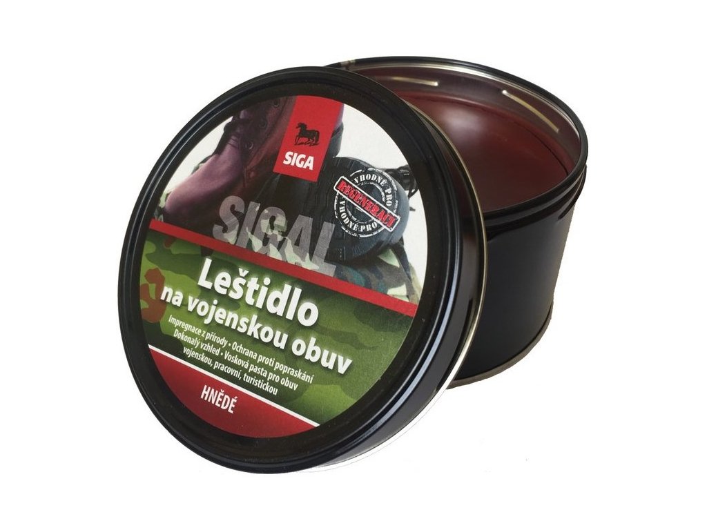 Vosk na obuv SIGAL v hnedej farbe je špeciálne vyvinutý pre ošetrovanie vojenskej, pracovnej a turistickej obuvi vystavenej náročným podmienkam. Obsahuje zmes prírodných a syntetických voskov, ktoré poskytujú vysokú vodoodpudivosť a chránia materiál pred vlhkosťou. Tento krém zároveň zvláčňuje kožu a chráni ju pred popraskaním. Použitie: Aplikujte na čistú, suchú obuv. Nechajte zaschnúť približne 15 minút. Pre dosiahnutie lesku vyleštite obuv kartáčom. Tento produkt je vhodný pre hladkú kožu. Pri použití na svetlú obuv môže dôjsť k jej stmavnutiu.Dodatočné parametre