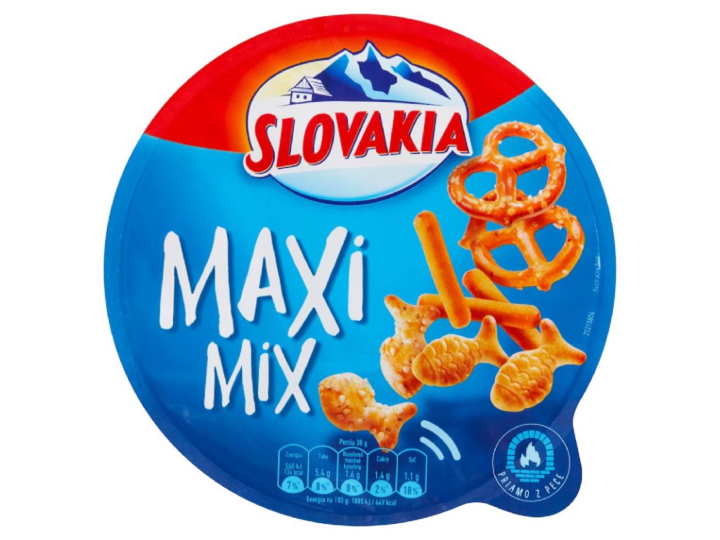 Slovakia Maxi Mix 100 g Zmes slaného trvanlivého pečiva priamo z pece. Zloženie: Pšeničná múka, Zemiakový škrob, Slnečnicový olej, Palmový olej, Zemiakový prášok, Jedlá soľ (max. 2, 8 %), Sezamové semienka, Cukor, Glukózový sirup, Sušená srvátka, Makové zrnká, Sušený syr, Aróma, Regulátor kyslosti (hydroxid sodný), Cmarový prášok, Paprikový prášok, Modifikovaný škrob (zemiaky, kukurica), Kvasnice, Múka zo pšeničného sladu, Emulgátor (mono- a diglyceridy mastných kyselín), Mliečne bielkoviny, Jogurt, Farbivo (paprikový extrakt), Korenie, Kyselina (kyselina citrónová), Sušené plnotučné mlieko, Cibuľový extrakt, Cesnakový extrakt. Informácie o alergénoch: Obsahuje: Mlieko, Sezam, Pšenica. Výživové údaje na 100 g: Energetická hodnota [kJ]: 1885 Energetická hodnota [kcal]: 449 Tuky [g]: 18 z toho nasýtené mastné kyseliny [g]: 5,3 Sacharidy [g]: 61 z toho cukry [g]: 4,7 Bielkoviny [g]: 9 Soľ [g]: 3,6 Skladovanie: Skladujte na suchom mieste chránenom pred prístupom priamych slnečných lúčov. Minimálna trvanlivosť do: viď označenie na prednej strane. Cena je za bal./100g