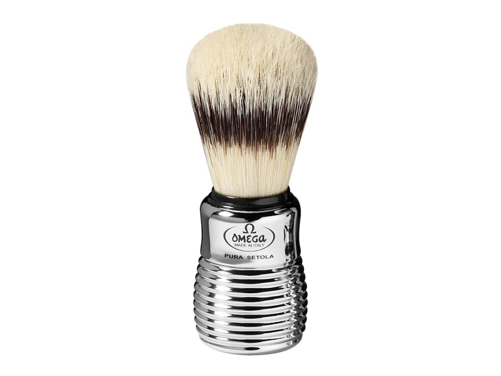 Štetka na holenie od talianskeho výrobcu OMEGA vyrobená zo syntetických vlákien s efektom jazvecích štetín a plastovou chrómovou rukoväťou s elegantným vzhľadom. Súčasťou balenia je stojanček na štetku.