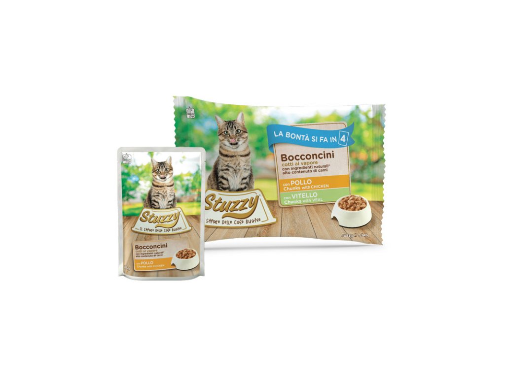 Stuzzy Cat Chunks Multipack kuracie a teľacie kúsky sú obľúbené kapsičky pre mačky s kúskami mäsa v chutnej omáčke vo výhodnom balení po 4 kusy.Dodatočné parametre