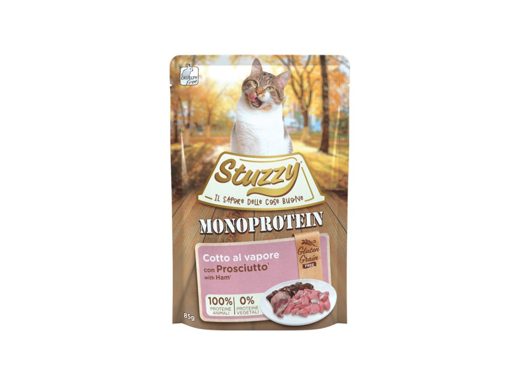 Stuzzy Cat Monoprotein GF - šunka je kapsička vyrobená z jediného druhu mäsa doplnená o lahodný vývar. Určená pre vyberavé mačky. Vďaka zloženiu bez obilnín je vhodná pri potravinovej intolerancii.Dodatočné parametre