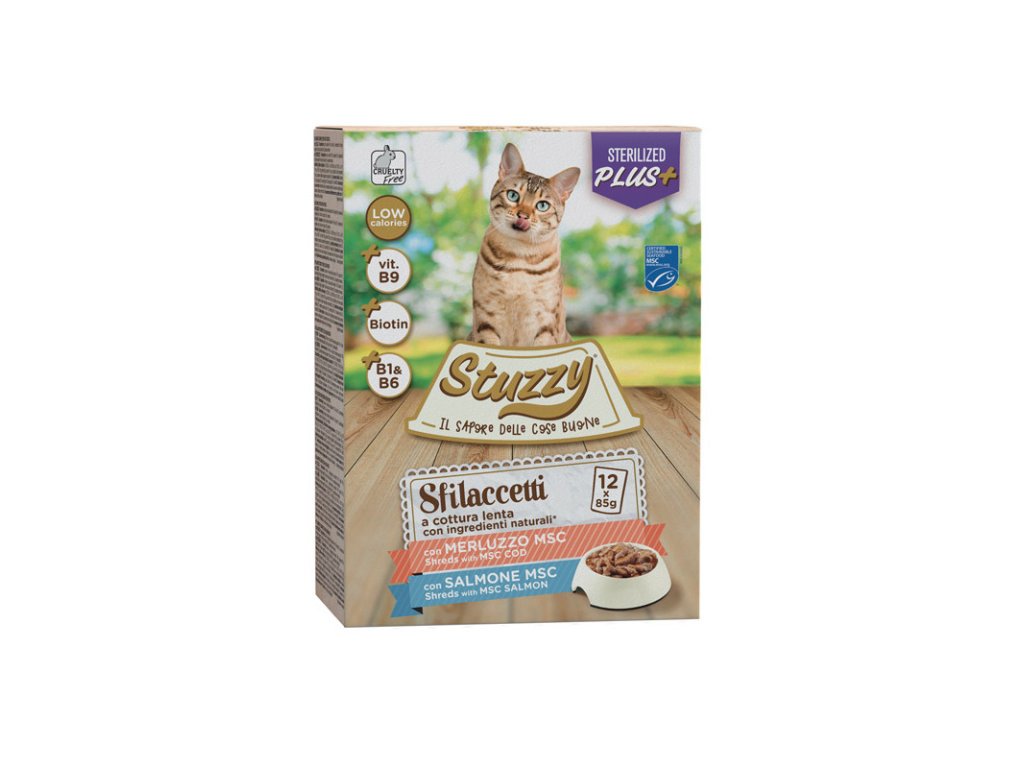Stuzzy Cat Shreds Multipack Sterilized trhané mäso z tresky a lososa - šťavnaté kúsky trhaného mäsa z rýb v chutnej omáčke pre zdravý vývoj a vitalitu kastrovanej mačky.Dodatočné parametre