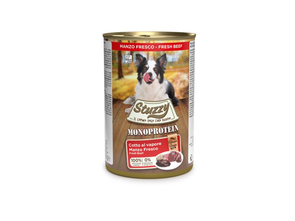 Stuzzy Monoprotein - Hovädzie je strava bez obilnín vyrobená z hovädzieho mäsa pre dospelých psov trpiacich na intoleranciu z niektorých druhov bielkovín.