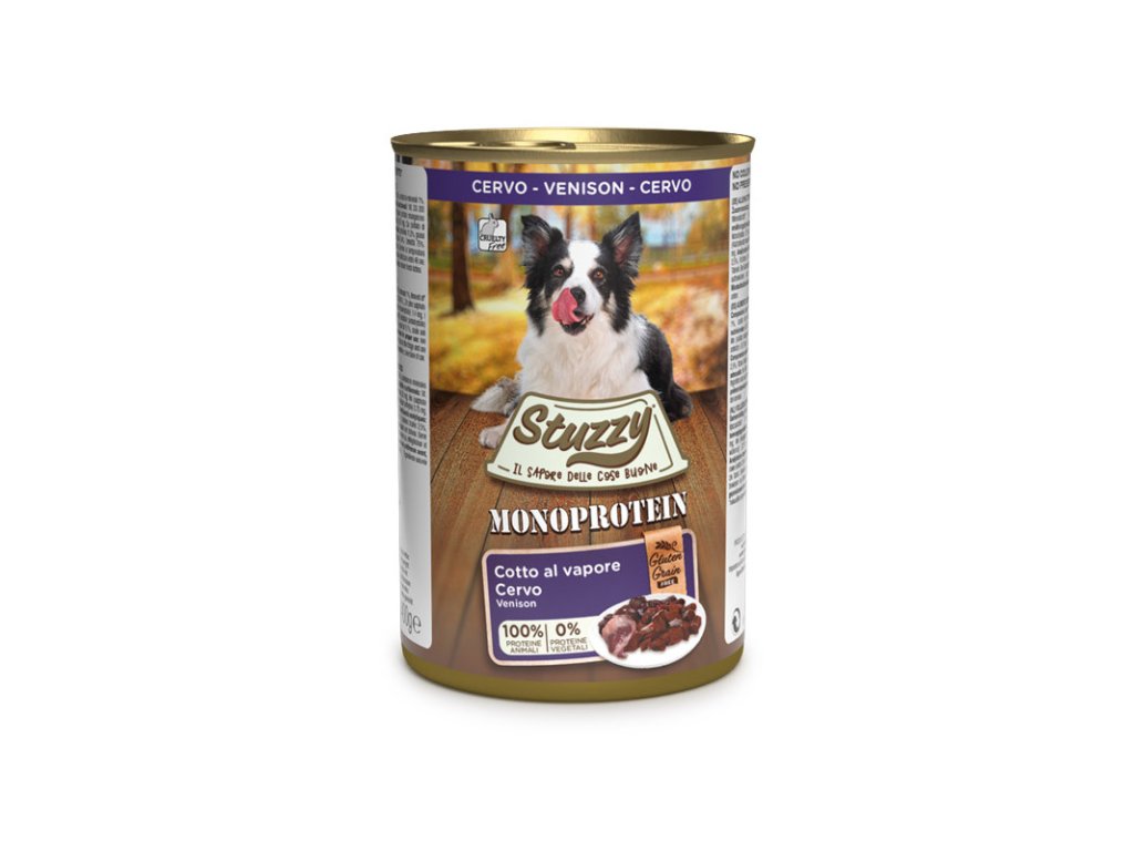 Stuzzy Monoprotein - Jelenie je strava bez obilnín vyrobená z jelenieho mäsa pre dospelých psov trpiacich na intoleranciu z niektorých druhov bielkovín.