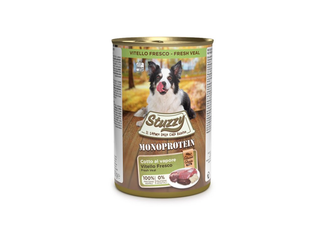 Stuzzy Monoprotein - teľacie je strava bez obilnín vyrobená z teľacieho mäsa pre dospelých psov trpiacich na intoleranciu z niektorých druhov bielkovín.