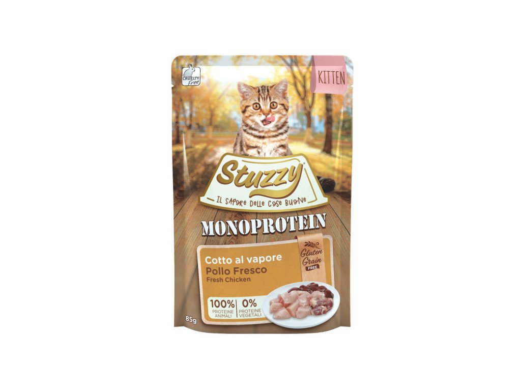 Stuzzy Kitten Monoprotein GF - kuracie je kapsička vyrobená z jediného druhu mäsa doplnená o lahodný vývar. Určená pre vyberavé mačiatka. Vďaka zloženiu bez obilnín je vhodná pri potravinovej intolerancii.Dodatočné parametre