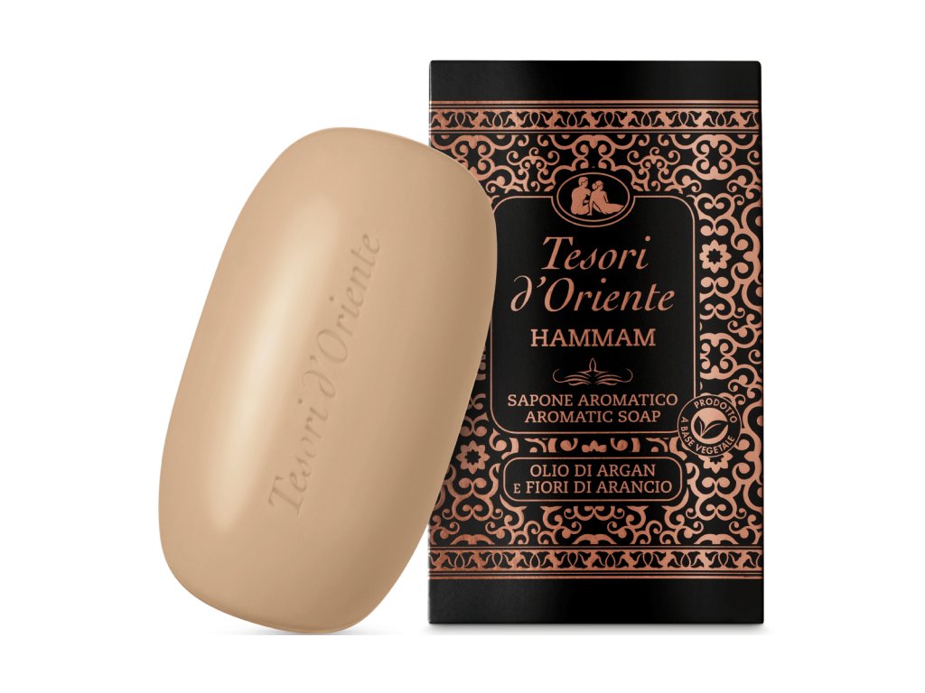 TESORI D´ORIENTE HAMMAM 125g Tuhé mydlo jemne čistí pokožku a dodáva jej zmyselnú a lákavú vôňu. Vďaka bohatej pene na rastlinnej báze zanecháva pokožku jemnú a hodvábnu. Tuhé mydlo TESORI D´ORIENTE HAMMAM 125g obsahuje esenciu vône: Arganový olej a pomarančový kvet. - hydratuje, vyživuje celé telo.