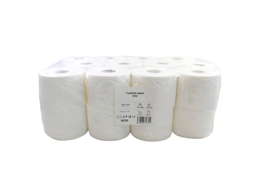 Toaletný papier,100% celulóza, 2vrst., 55m – 24ks Materiál: 100 % celolóza Dĺžka návinu: 55m Priemer rolky: 135 mm Farba: biela Počet vrstiev: 2 Cena je za bal./24ksDodatočné parametre