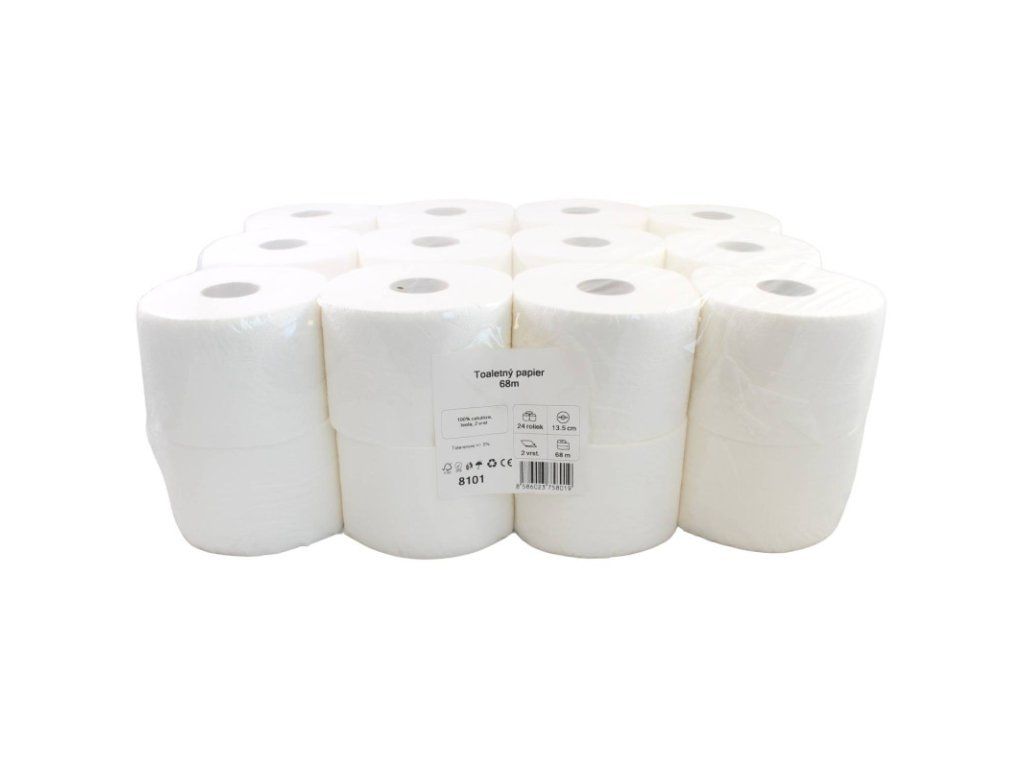 Toaletný papier,100% celulóza, 2vrst., 68m – 24ks Materiál: 100 % celolóza Dĺžka návinu: 68m Priemer rolky: 135 mm Farba: biela Počet vrstiev: 2 Cena je za bal./24ksDodatočné parametre