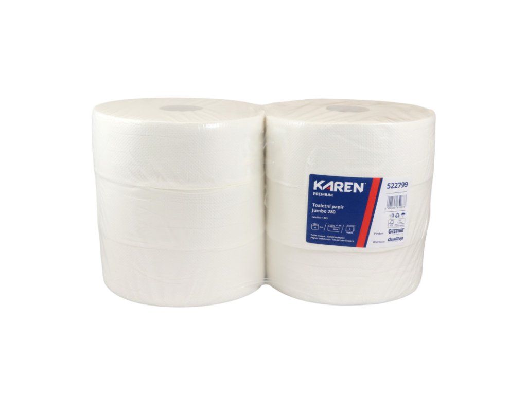 Toaletný papier KAREN JUMBO Ø 25 cm, 265m, 2vrstvová 100% celulóza 100% celulóza Balenie: 6 ks Priemer: 25 cm Dĺžka: 265mDodatočné parametre