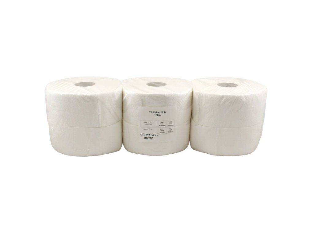 Toaletný papier SOFT JUMBO Ø 23cm, 180m 2vrst. 6ks Materiál: 100% celulóza Dĺžka návinu: 180 m Dutinka: 5,8 cm Farba: biela Počet vrstiev: 2 Balenie : 6ksDodatočné parametre