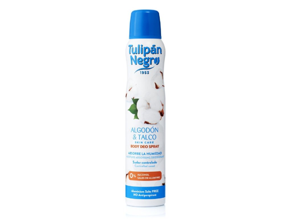 Tulipán Negro Deo Spray Algodón&Talco 200ml extra intenzívna čistá vôňa sprejový dezodorant s bavlnou a mastencem poskytuje maximálnu jemnosť a starostlivosť o pokožku poskytuje pocit sviežosti v podpazuší, absorbuje vlhkosť a zanecháva dlhotrvajúcu jemnú a delikátnu vôňu jeho zloženie je špeciálne určené na kontrolu potenia doprajte svojej pokožke gesto trvalého pohodlia a pohody bez parabénov a hliníkových solí Cena je za 1ks/200ml