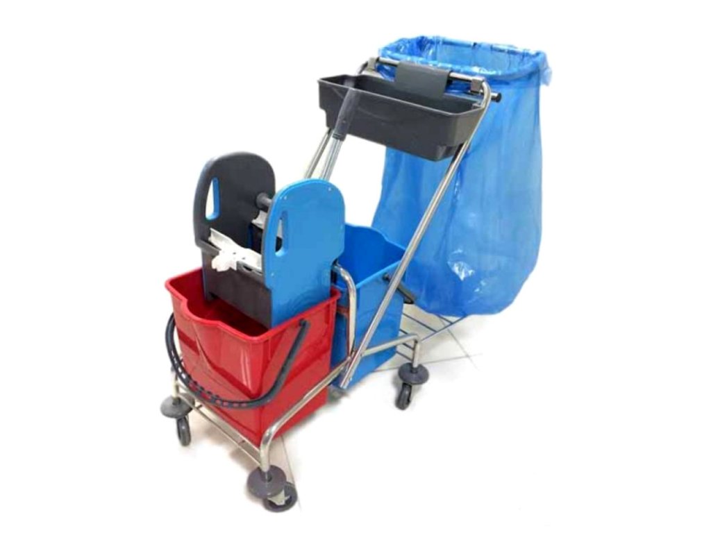 Upratovací vozík 2 x 18l vedrá, chrom. konštrukcia , žmýkací lis, držiak na smeti Tento kvalitný upratovací vozík s robustnou kovovou pochrómovanou konštrukciou a s dvoma vedrami zodpovedá vysokým hygienickým štandardom pre upratovanie. Rám vozíka je vyrobený z kvalitného nehrdzavejúceho materiálu s vysokou odolnosťou voči poškodeniu. Rukoväť vozíka je vyrobená z pevnej chrómovanej kovovej trubky a je na obe strany preklápateľná. Vozík obsahuje 2 ks vedier, ktoré sú farebne rozlíšené s objemom 18 litrov. Obsahuje kvalitný žmýkací lis na žmýkanie mopov. Má 4 otočné kolieska s plastovými chráničmi proti poškodeniu koliesok a stien. Vozík je vhodný do priemyselných oblastí, kancelárií, verejných zariadení ale aj na čistenie citlivých oblastí ako sú nemocnice, laboratóriá, ošetrovne, plavárne a sanitárne zariadenia... Ideálne pre firmy, úrady, budovy, sklady, hotely, výrobné závody, bytové domy, školy, kancelárie, obchodné domy, nemocnice. Tento upratovací vozík poskytuje vysoký komfort pri upratovaní. Príslušenstvo: Konštrukcia robustný pochrómovaný kov 2 x 18 l vedrá farebne rozlíšené 4 otočné kolieska s plastovými chráničmi proti poškodeniu stien a zariadenia Žmýkač (lis) na žmýkanie mopu. Vanička pre upratovacie pomôcky Rozmery vozíka v zloženom stave: dĺžka 101 cm x šírka 41 cm x výška 86 cm Balenie obsahuje 1 ks vozíka s príslušenstvom.
