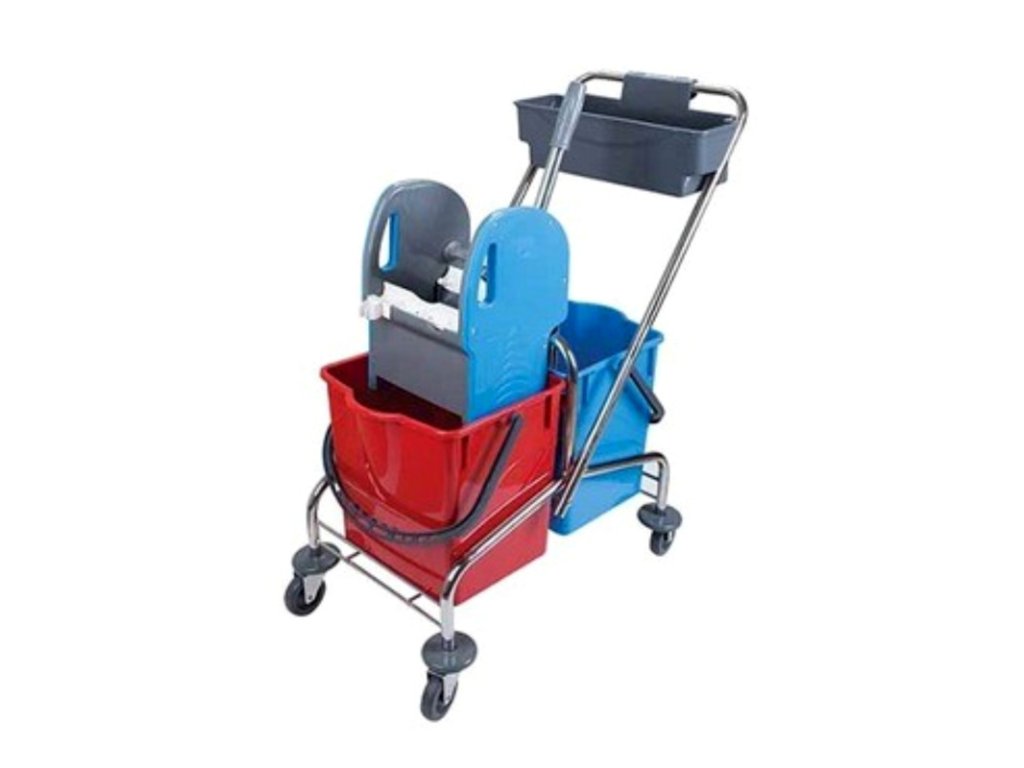 Upratovací vozík 2 x 18L vedrá, chrom. konštrukcia , žmýkací lis, vanička Tento kvalitný upratovací vozík s robustnou kovovou pochrómovanou konštrukciou a s dvoma vedrami zodpovedá vysokým hygienickým štandardom pre upratovanie. Rám vozíka je vyrobený z kvalitného nehrdzavejúceho materiálu s vysokou odolnosťou voči poškodeniu. Rukoväť vozíka je vyrobená z pevnej chrómovanej kovovej trubky a je na obe strany preklápateľná. Vozík obsahuje 2 ks vedier, ktoré sú farebne rozlíšené s objemom 18 litrov. Obsahuje kvalitný žmýkací lis na žmýkanie mopov. Má 4 otočné kolieska s plastovými chráničmi proti poškodeniu koliesok a stien. Vozík je vhodný do priemyselných oblastí, kancelárií, verejných zariadení ale aj na čistenie citlivých oblastí ako sú nemocnice, laboratóriá, ošetrovne, plavárne a sanitárne zariadenia... Ideálne pre firmy, úrady, budovy, sklady, hotely, výrobné závody, bytové domy, školy, kancelárie, obchodné domy, nemocnice. Tento upratovací vozík poskytuje vysoký komfort pri upratovaní. Príslušenstvo: Konštrukcia robustný pochrómovaný kov 2 x 18 l vedrá farebne rozlíšené 4 otočné kolieska s plastovými chráničmi proti poškodeniu stien a zariadenia Žmýkač (lis) na žmýkanie mopu. Vanička pre upratovacie pomôcky Rozmery vozíka v zloženom stave: dĺžka 68 cm x šírka 41 cm x výška 86 cm Balenie obsahuje 1 ks vozíka s príslušenstvom.