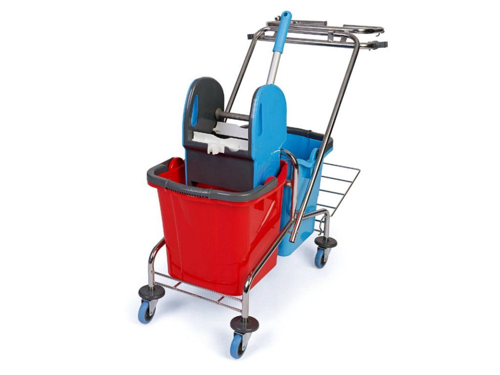 Upratovací vozík 2 x 25l vedrá, chrom. konštrukcia , žmýkací lis, držiak na smeti Tento kvalitný upratovací vozík s robustnou kovovou pochrómovanou konštrukciou a s dvoma vedrami zodpovedá vysokým hygienickým štandardom pre upratovanie. Rám vozíka je vyrobený z kvalitného nehrdzavejúceho materiálu s vysokou odolnosťou voči poškodeniu. Rukoväť vozíka je vyrobená z pevnej chrómovanej kovovej trubky a je na obe strany preklápateľná. Vozík obsahuje 2 ks vedier, ktoré sú farebne rozlíšené s objemom 25 litrov. Obsahuje kvalitný žmýkací lis na žmýkanie mopov. Má 4 otočné kolieska s plastovými chráničmi proti poškodeniu koliesok a stien. Vozík je vhodný do priemyselných oblastí, kancelárií, verejných zariadení ale aj na čistenie citlivých oblastí ako sú nemocnice, laboratóriá, ošetrovne, plavárne a sanitárne zariadenia... Ideálne pre firmy, úrady, budovy, sklady, hotely, výrobné závody, bytové domy, školy, kancelárie, obchodné domy, nemocnice. Tento upratovací vozík poskytuje vysoký komfort pri upratovaní. Príslušenstvo: Konštrukcia robustný pochrómovaný kov 2 x 25 l vedrá farebne rozlíšené 4 otočné kolieska s plastovými chráničmi proti poškodeniu stien a zariadenia Žmýkač (lis) na žmýkanie mopu Držiak na smeti Rozmery vozíka v zloženom stave: dĺžka 101 cm x šírka 41 cm x výška 86 cm Balenie obsahuje 1 ks vozíka s príslušenstvom.Dodatočné parametre
