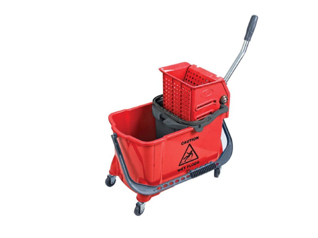 Upratovací vozík KENTUCKY PROFI červený 24 L + 8L žmýkač Vozík KENTUCKY PROFI pozostáva z dvojkomorového vedra z kvalitného plastu ABS, ktorý sa vyznačuje vysokou odolnosťou proti prasknutiu. Používa čeľusťový lis, ktorého je súčastou 8 litrové vedro na znečistenú vodu.Vďaka kvalitnému lisu je proces žmýkania ľahký. Tento lis pracuje s plochými ako i šnúrkovými mopmi a jeho oceľová rukoväť vám umožňuje bezpečný pojazd s vozíkom. Vhodný pre menšie prevádzky a domácnosti.Dodatočné parametre