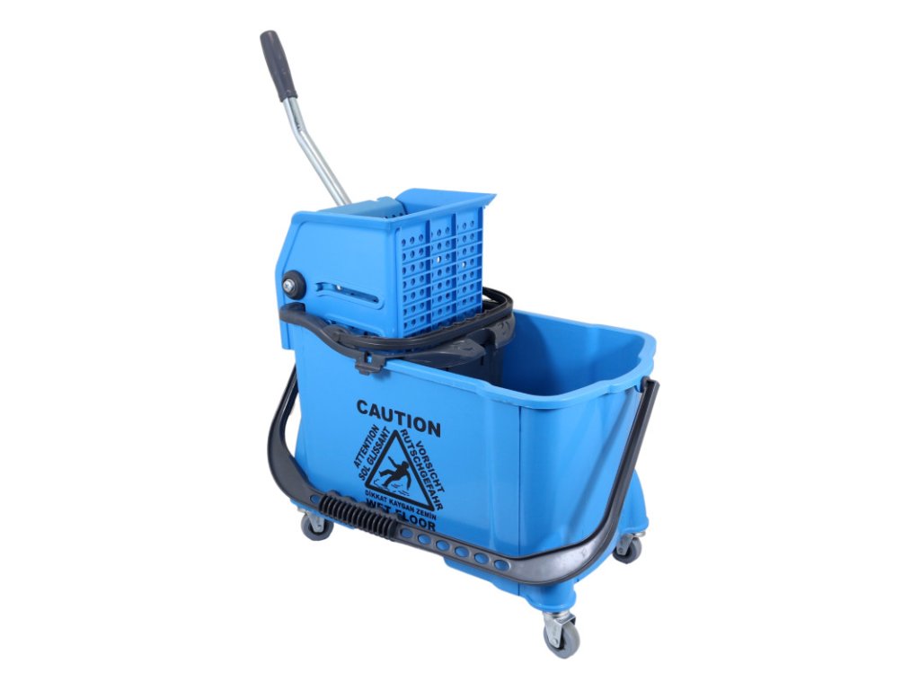 Upratovací vozík KENTUCKY PROFI modrý 24 L + 8L žmýkač Vozík KENTUCKY PROFI pozostáva z dvojkomorového vedra z kvalitného plastu ABS, ktorý sa vyznačuje vysokou odolnosťou proti prasknutiu. Používa čeľusťový lis, ktorého je súčastou 8 litrové vedro na znečistenú vodu.Vďaka kvalitnému lisu je proces žmýkania ľahký. Tento lis pracuje s plochými ako i šnúrkovými mopmi a jeho oceľová rukoväť vám umožňuje bezpečný pojazd s vozíkom. Vhodný pre menšie prevádzky a domácnosti.
