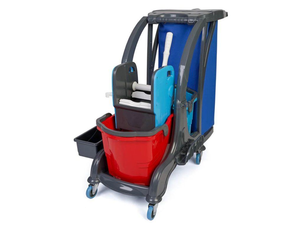 Profesionálny servisný vozík pre veľké priestory ako pracoviská, kancelárie, obchodné centrá, nemocnice, hotely. 2 X Vedierka 25 l (červené a modré) 1 X Žmýkací lis 1 X Vodotesné vrece na odpadky s vekom 1 X Držiak na mop 1 x Vanička na dve vedierka Rozmery vozíka v zloženom stave: šírka 53 cm x dĺžka 80 cm x výška 100cmDodatočné parametre