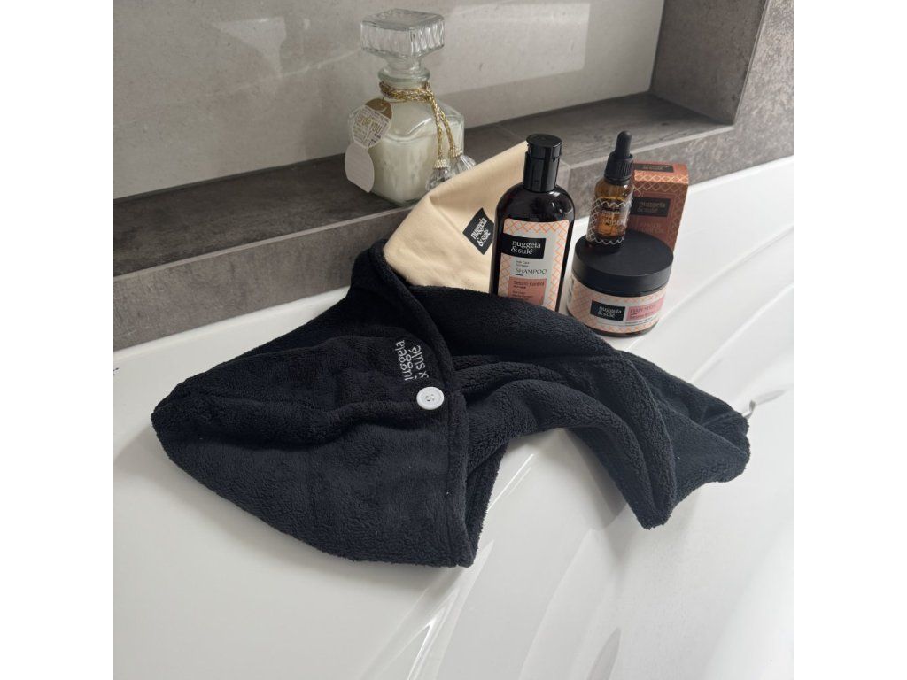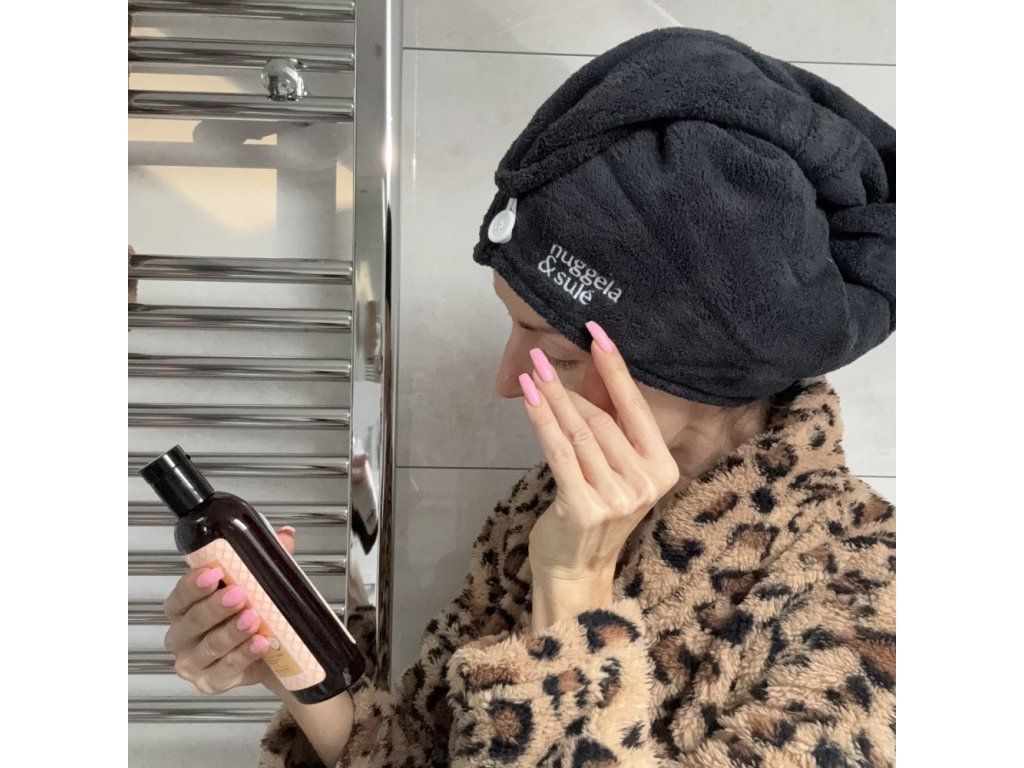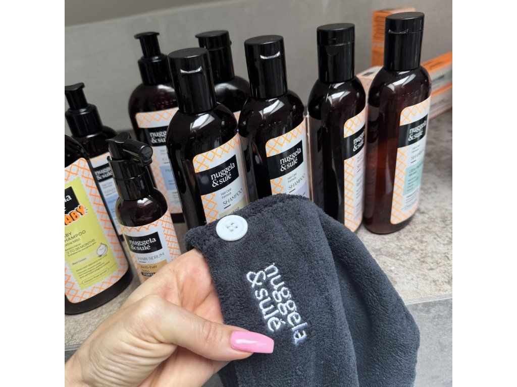 Uterák na vlasy Nuggela & Sulé Klasické bavlnené uteráky môžu pri sušení poškodzovať vlasové vlákna a zvyšovať lámavosť či krepovatenie. Najmä pri suchých, krepovitých či farbených vlasoch. Tento špeciálne navrhnutý uterák na vlasy z jemného mikrovlákna je šetrnejší a efektívnejší. Vďaka svojej vysoko nasiakavosti absorbuje vlhkosť rýchlejšie ako bežný uterák. Bez potreby silného žmýkania, čím chráni štruktúru vlasu a zanecháva ich hladké a lesklé. Mikrovlákno je extra mäkké na dotyk, ľahké a veľmi účinné pri odstraňovaní vody z vlasov. Tento uterák je ideálny aj pre tie najjemnejšie a najcitlivejšie vlasy. Vlasy sú po použití menej náchylné na lámavosť či statickú elektrinu. Prečo je tento uterák pre vás skvelým doplnkom Želáte si rýchlejšie sušenie a menej tepla? Mikrovlákno efektívne absorbuje vodu, takže môžete: skrátiť čas používania fénu či iných teplých stylingových nástrojov znížiť riziko tepelného poškodenia vlasov užiť si vláčnejšie suché vlasy bez tvrdých koncov Tento uterák tak šetrí vlasové vlákna a znižuje lámavosť, ktorú často spôsobuje agresívne žmýkanie alebo teplý vzduch fénu. Ako používať uterák – krok za krokom Správne používanie je kľúčom k najlepším výsledkom: Po umytí preklopte vlasy dopredu a položte uterák na hlavu tak, aby širšia časť bola vzadu pri zátylku. Zúženú časť uteráka s vlasmi jemne stočte do „vrkoča“ smerom nahor. Upevnte uterák pomocou gombíka a pútka, aby bezpečne držal. Nechajte pôsobiť 10–20 minút alebo podľa potreby – vlhkosť bude efektívne absorbovaná bez poškodenia vlasov. Po použití uterák jednoducho vyperte v práčke alebo ručne a nechajte vyschnúť. Pre koho je uterák vhodný Tento uterák je skvelou voľbou pre: všetky typy vlasov – od tenkých a jemných po husté a kučeravé tých, ktorí chcú šetrné sušenie bez tepelného stresu osoby s citlivou či poškodenou vlasovou štruktúrou tých, ktorí používajú masky alebo zábaly – uterák udrží produkt na mieste a umožní lepšiu penetráciu účinných látok všetkých, ktorí chcú redukované krepovatenie a lesklejšie vlasy po každom umytí Zaujímavosti a benefity, prečo to funguje? Mikrovlákno je známe svojou mimoriadnou absorpčnou schopnosťou – absorbuje vodu rýchlejšie než klasické bavlnené uteráky a zároveň je jemnejšie k vlasovej kutikule, čo pomáha zachovať prirodzený lesk a elasticitu vlasov. Použitie takéhoto uteráka môže výrazne znižiť mechanické trenie, ktoré často vedie k lámavosti a krepovateniu. Najmä pri kučeravých a suchých vlasoch. Odporúčané kombinácie pre maximálny efekt Výživná Tucuma maska – po umytí vlasov naneste masku a zabaľte do uteráka na intenzívnu hydratáciu. Prírodné šampóny a kondicionéry Nuggela & Sulé – uterák podporí ich účinnosť tým, že jemne pripraví vlasy na vstrebávanie aktívnych látok. Masážna kefa na pokožku hlavy – skombinujte s uterákom po umytí pre komplexnú vlasovú starostlivosť. Tipy pre ešte lepšiu vlasovú rutinu Po použití masky nechajte uterák pôsobiť dlhšie (20–40 min) – maska sa lepšie vstrebáva a výsledok je intenzívnejší. Pri dlhších vlasoch prekrúťte uterák dvakrát, aby držal pevnejšie bez skĺznutia. Ak chcete znížiť statickú elektrinu, použite uterák spolu s hydratačným kondicionérom a nechajte vlasy krátko sušiť bez fénu. Uterák je vyrobený z ľahkého, mäkkého mikrovlákna, ktoré je zároveň veľmi absorbčné a rýchloschnúce. Je navrhnutý ako turbanový uterák s pútkom či gombíkom, takže pevne drží na hlave bez toho, aby kĺzal alebo ťahal vlasy. Upozornenie: Perte ručne alebo v práčke na studeno. Nebielte. Nežehlite.Dodatočné parametre