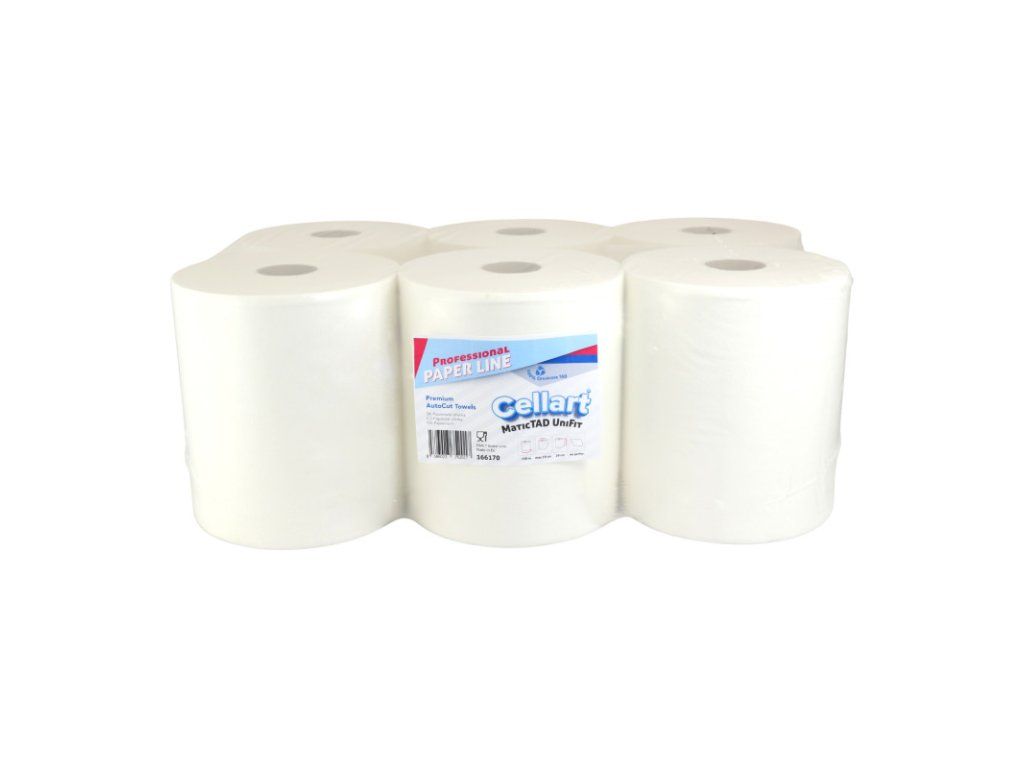166170 – Utierka CELLART Craft MaticTAD UniFit, 150 m (6ks) Utierka MaticTAD UniFit je vyrobená z najkvalitnejšej TAD celulózy, určená pre automatické dávkovacie systémy. Utierka sa vyznačuje veľmi vysokou účinnosťou, ktorej je výsledkom vysoká nasiakavosť, vyššej ako v prípade klasickej celulózy. Elegantná textúra robí z celulózovej utierky TAD prestížny produkt. Kompatibilná utierka aj do systémových zásobníkov TORK, Merida, Kimberly Clark, Katrin, Lotus a iných s použitím dutinky z rolky s plastovými koncovkami od vášho pôvodného dodávateľa. Vyrobená technológiou TAD, ktorá dodáva materiálu jemnosť a zároveň zvyšuje absorpciu. Tento produkt je certifikovaný a bezpečný na použitie na miestach spracovania a prípravy potravín. Počet vrstiev : jednovrstvové Priemer dutinky : 45 mm Materiál : celulóza TAD Hmotnosť papiera : 29g/m2 Hmotnosť kotúča : 0,87 kg Dĺžka kotúča (m) : 150 Šírka kotúča (mm) : 200 Priemer kotúča max (mm) : 190 Počet útržkov (ks) : neperforovaná Cena za balenie : 6 ksDodatočné parametre