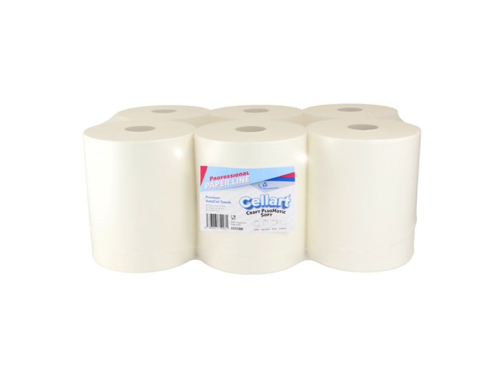 122280 - Utierka CELLART PlusMatic Soft 280, 270m (6ks) Papierové utierky PlusMatic sú veľmi kvalitné a extra jemné. Utierky sú vyrobené zo 100 % celulózy, na dotyk veľmi príjemné a veľmi dobre savé. Utierka funguje oveľa lepšie v porovnaní s viacvrstvovými uterákmi, ktoré obsahujú lepiacu vrstvu, ktorá znižuje nasiakavosť a robí utierku tvrdou a môže nadmerne zaťažovať zásobník. Nízka prašnosť a mechanická pevnosť ovplyvňujú optimalizáciu spotreby utierok. Dlhý kotúč umožňuje výrazne znížiť frekvenciu výmeny utierok v zásobníku. Utierka perfektne funguje s väčšinou automatických dávkovačov obľúbených značiek. Kompatibilná utierka aj do systémových zásobníkov TORK, Merida, Kimberly Clark, Katrin, Lotus a iných s použitím dutinky z rolky s plastovými koncovkami od vášho pôvodného dodávateľa. Tento produkt je certifikovaný a bezpečný na použitie na miestach spracovania a prípravy potravín. Priemer dutinky : 45 mm Počet vrstiev : jednovrstvové Materiál : 100% celulóza Hmotnosť papiera : 34 g/m2 Hmotnosť kotúča : 1,84 kg Dĺžka kotúča (m) : 270 Šírka kotúča (mm) : 200 Priemer kotúča (mm) : 190 Počet útržkov (ks) : neperforovaná Cena za balenie : 6 ksDodatočné parametre