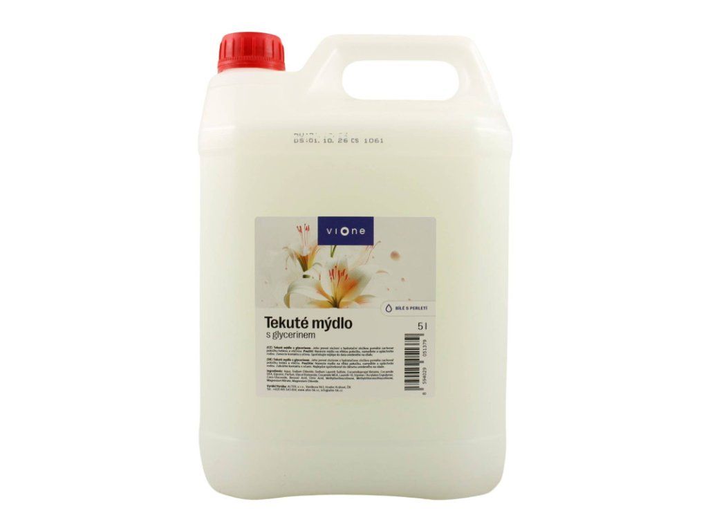 VIONE TEKUTÉ MYDLO s bielou perleťou 5l kanister. Tekuté mydlo s glycerínom. Jeho jemné zloženie s hydratačným účinkami pomáha zachovať pokožku hodvábnu a vláčnu. Použitie: Naneste potrebné množstvo tekutého mydla. Umývajte sa ako mydlom, uvoľnené nečistoty opláchnite prúdom pitnej vody. Cena je za 1ks/5lDodatočné parametre