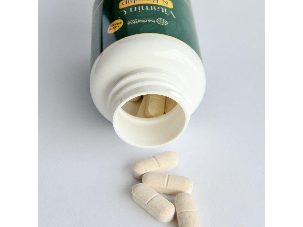 | Zloženie: | kyselina L-askorbová (vitamín C), objemové činidlá: mikrokryštalická celulóza, sorbitol; 90% extrakt z ruže šípovej (Rosa canina), protihrudkujúca látka: stearán horečnatý rastlinného pôvodu |