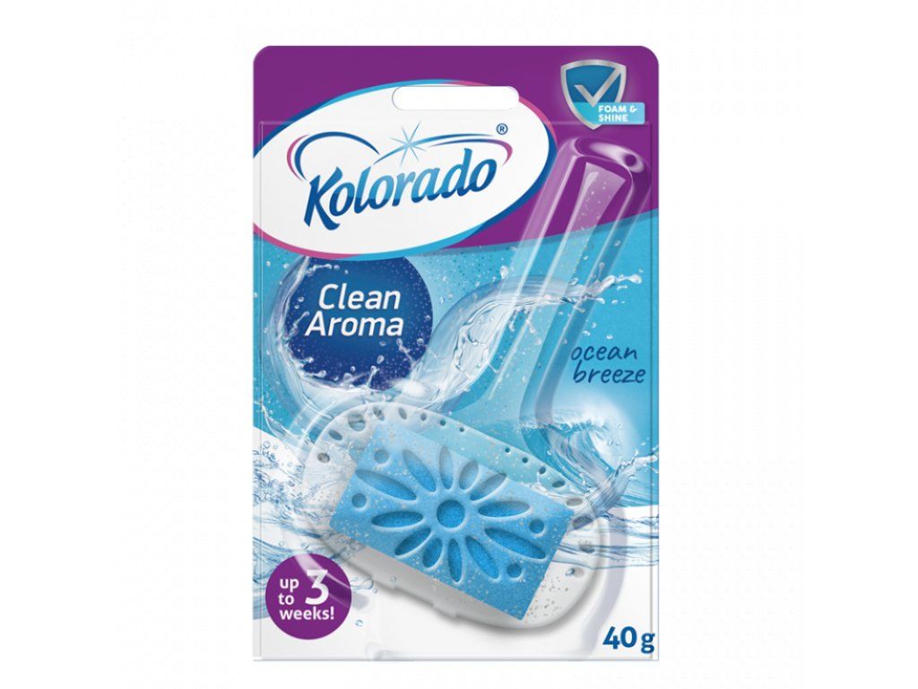 WC blok Kolorado Clean Aroma Oceán 40g Funkčnosť až 3 týždne Zaujímavé a výrazné tóny vône Priehľadný košík s trblietavým vzorom Vylepšená účinnosť prispievajúca k čistote Neobsahuje fosfáty Poskytuje intenzívnu penuDodatočné parametre