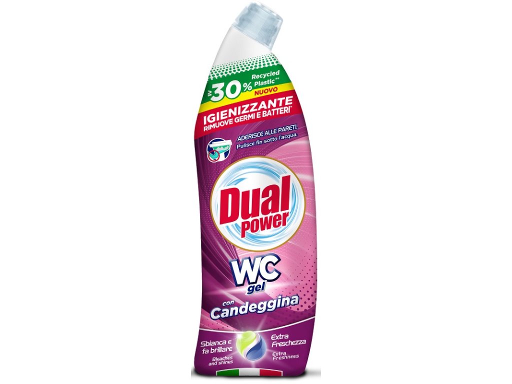 Dual Power WC Gel Candeggina je čistiaci prostriedok určený na čistenie a dezinfekciu toaliet. Obsahuje dve hlavné zložky: čistiace gél a bielidlo (candeggina), ktoré spolu účinne odstraňujú nečistoty, vápnikové usadeniny a zápach z toalety. Vďaka kombinácii čistiaceho gélu a bielidla je tento produkt schopný dezinfikovať povrchy a zároveň poskytovať vysokú úroveň čistoty.