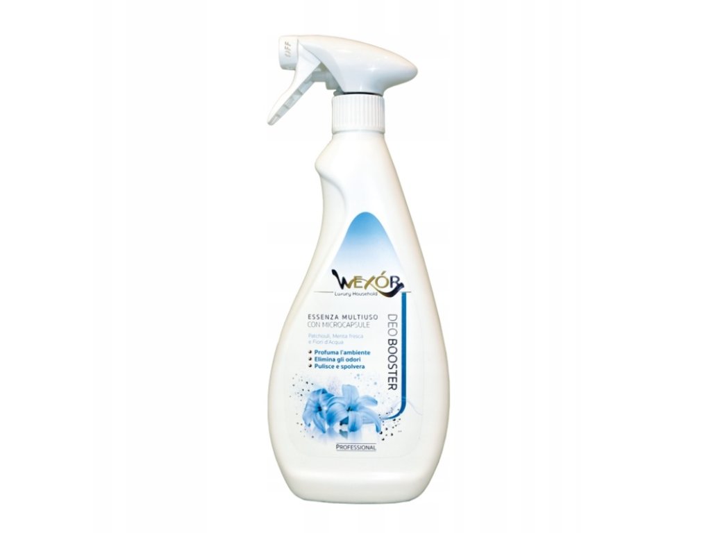 Wexór Fiori d’acqua DeoBooster je hyperkoncentrovaný osviežovač vzduchu: len niekoľko streknutí zaručuje bezkonkurenčný, dlhotrvajúci pocit čistej vône vďaka vysokej koncentrácii vzácnych esencií a prítomnosti mikrokapsúl. Eliminuje nepríjemné pachy, vôňa sa dlhodobo udržuje na nábytku a nábytkových tkaninách, ideálna na čistenie všetkých povrchov.