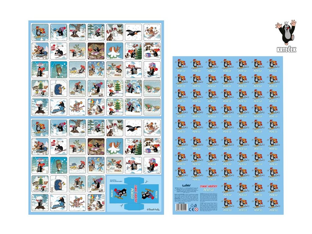 Vystrihovacie pexeso Krtko - Zimné hrátky. Jedná sa o pexeso s motívmi Krtka a jeho priateľov, ktoré je zamerané na zimnú tematiku. Pexeso je tradičná stolová hra, ktorá slúži na precvičovanie pamäte a sústredenia. Hra rozvíja schopnosť zapamätať si, kde sa jednotlivé obrázky nachádzajú, a podporuje tak kognitívne zručnosti, predovšetkým pamäť a koncentráciu. Pexeso je obľúbené medzi deťmi, ale aj dospelými, pretože je zábavné a jednoduché na pochopenie. NÁVOD NA HRU PEXESO: Pexeso môžu hrať najmenej dvaja hráči. Všetky rozstrihané kartičky sa zamiešajú a rozložia obrázkom dole do štvorca 8 x 8 kartičiek. Nesmie sa pri tom pozerať na obrázok. Hráči si určia poradie hry. Hráči postupne otáčajú vždy dve kartičky s cieľom nájsť dvojice s rovnakými obrázkami. Pokiaľ hráč nájde dvojicu, ponechá si ju a pokračuje v ťahu. Pokiaľ nie, kartičky sa otočia späť lícom dole a hrá ďalší hráč. Cieľom hry je nazbierať čo najviac dvojíc, a tým sa stať víťazom. PAPIER: krieda matná 350 g + lamino lesk 1/1 VEĽKOSŤ HRACÍCH KARIET: 51x51cm VAROVANIE: Nevhodné pre deti do 3 rokov. Nebezpečenstvo vdýchnutia a prehltnutia malých častíc. Uvedená cena je za 1 ks.Dodatočné parametre