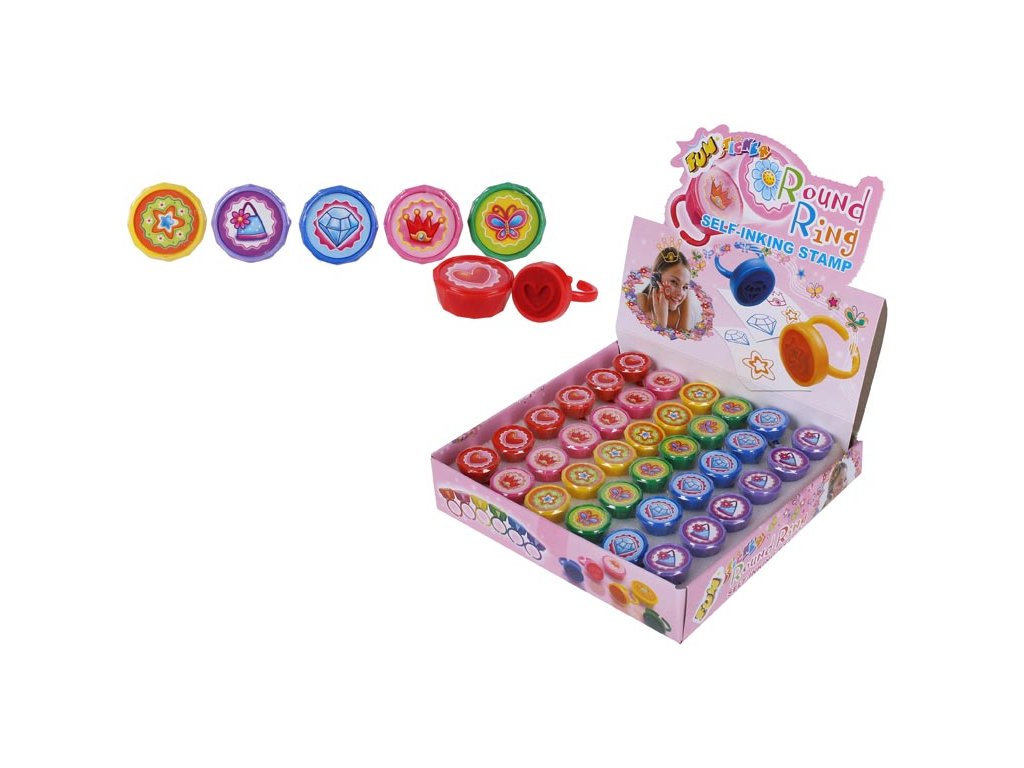 Detská, samonamáčacia, okrúhla pečiatka z plastu v tvare prstienka. Nakresli si obrázok a vyzdob ho pečiatkami! Samotlačiace pečiatky sú ideálne pre všetky kreatívne deti, ktoré si rady maľujú! Na prednom obale je vždy vyobrazený určitý obrázok. Pečiatky sú v rôznych farbách. Určené pre deti od 3 do 6 rokov. Varovanie: Slúži ako výtvarná pomôcka na potlač papiera. Používať pod dozorom dospelej osoby. Obal odstráňte z dosahu detí. Všetkých 36 ks je uložených v krabičke. Dodávame v mixe 6 ks podľa skladovej zásoby. Uvedená cena je za 1 ks.Dodatočné parametre