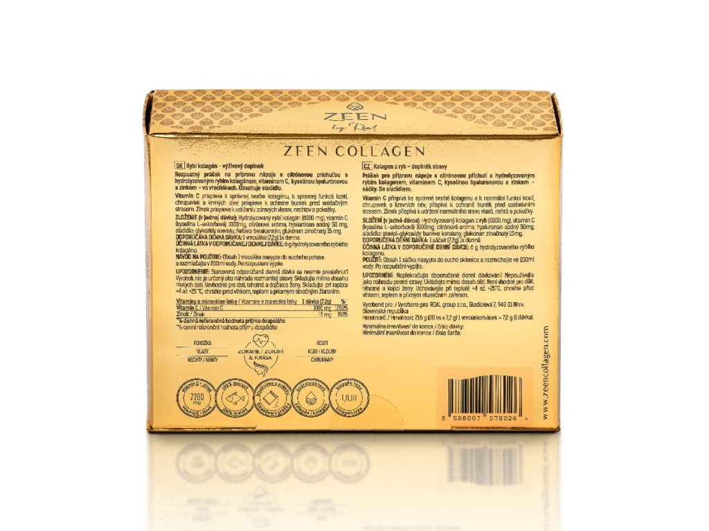 6000 mg morský BIO-AKTÍVNY hydrolyzovaný kolagén typu I,II,III bez chcemických prísad má príjemnú citrónovou príchuť a je balený v praktických vrecúškach pre pohodlné dávkovanie. Zeen kolagén obsahuje aj 1000 mg vitamínu C, 50 mg kyseliny hyalurónovej a 15 mg zinku. Vitamín C dáva telu optimálnu šancu naplno využiť kolagén, optimalizuje biologickú dostupnosť doplnku kolagénu, pretože je nevyhnutný pre jeho syntézu.